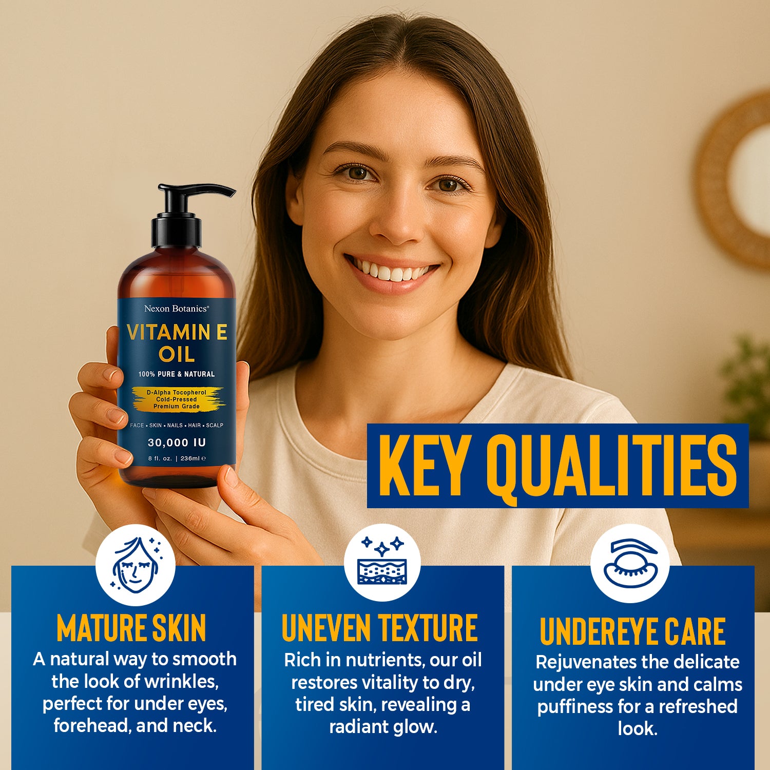 Experience 30,000 IU of nourishing Vitamin E blended with sweet almond oil for skin and hair care. Perfect for dry skin, split ends, itchy scalp, and brittle nails, without parabens or greasy residue. This clean, 100% natural blend helps rejuvenate tired skin and hair. A must-have for softness, strength, and all-over radiance. Made in the USA, cold-pressed, and non-GMO Vitamin E oil.